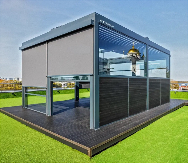Биоклиматическая пергола с вертикальным раздвижным остеклением из каленого стекла третьего класса прочности является универсальным решением для дома или ресторана. Конструкция позволяет легко превратить панорамное остекление в ограждение с защитой от ударов в зоне ног с помощью одного нажатия кнопки на пульте управления. Подъём стекла осуществляется вертикально вверх и может открываться и закрываться секциями. Веранда будет радовать вас даже зимой, но механизм раздвижного остекления желательно использовать только в теплое время года, чтобы избежать порчи оборудования из-за обледенения стекол.